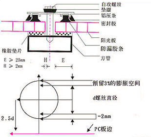 a、螺絲或鉚釘穿孔安裝時,板材的開孔孔徑須比螺栓或鉚釘直徑大50%,以備熱脹冷縮時板材產生位移。禁止任何直接開孔同時固定螺絲或者鉚釘的做法,無法預留熱脹冷縮空間。