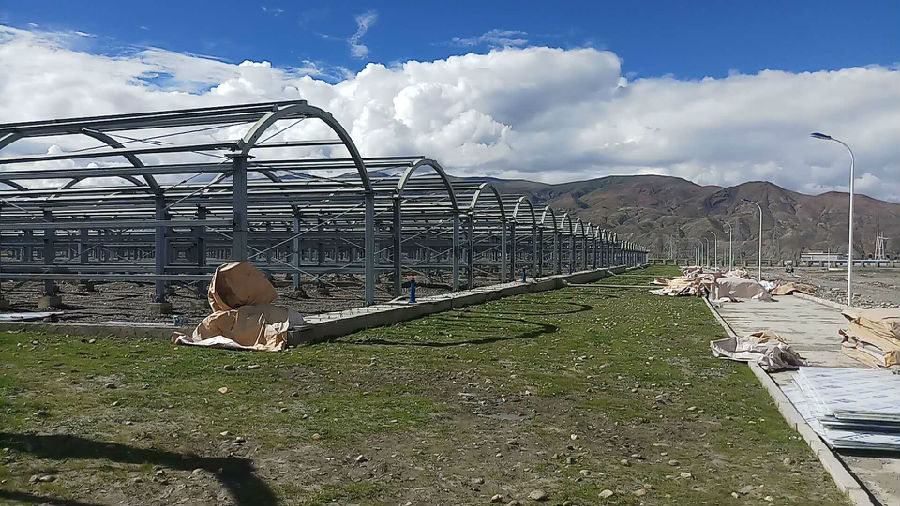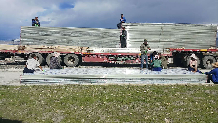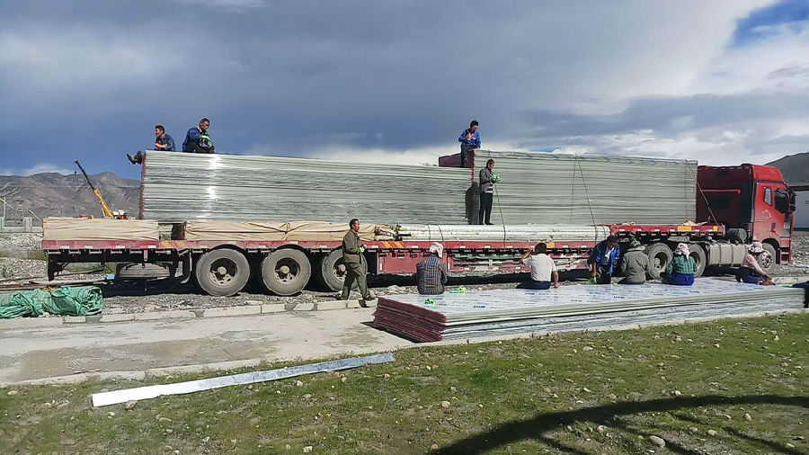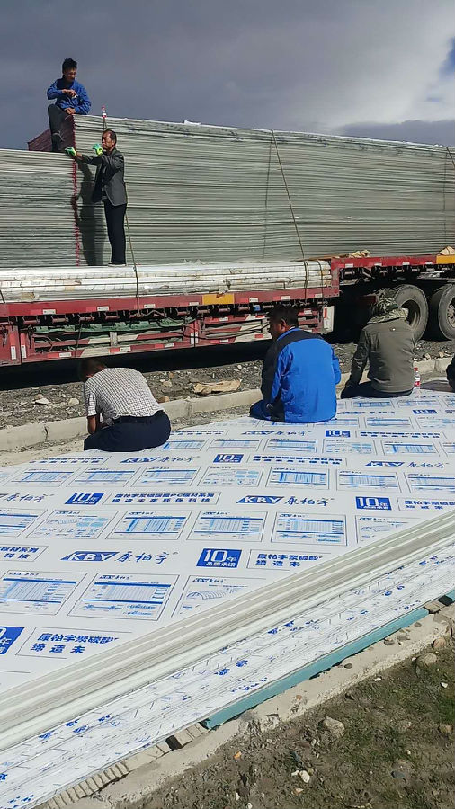 西藏(zang)農業大棚項目(mu),第一(yi)批一(yi)萬五千平米的康柏宇防霧滴(di)陽光板到達工地現(xian)場。